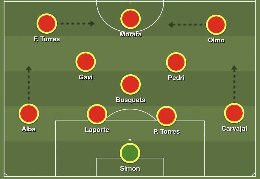 Simon; Alba, Laporte, P. Torres, Carvajal; Gavi, Busquets, Pedri; F. Torres, Morata, Olmo